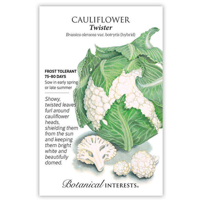 Variety Info: White, tightly packed, 6.5"- 7" wide and 4" tall heads, with large, curled leaves. 'Twister' is self-blanching.