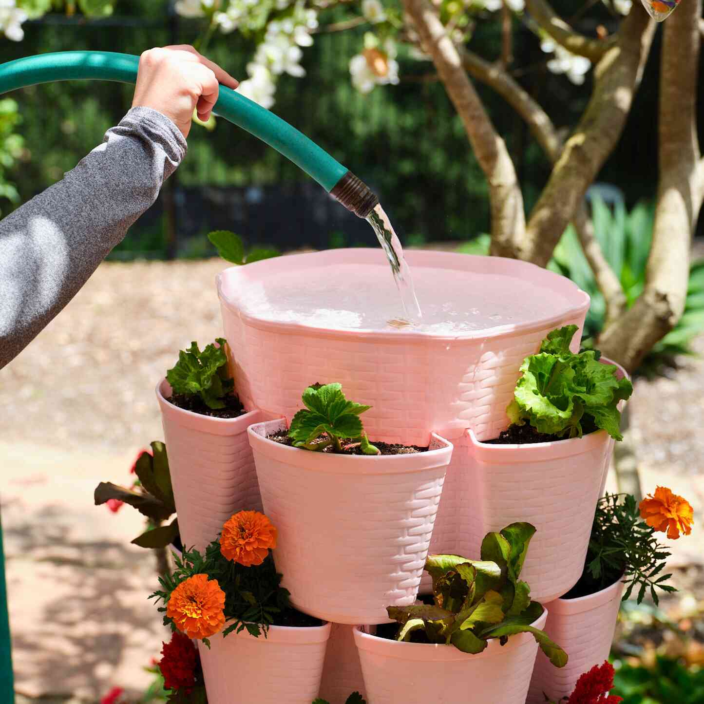 Effortless watering with a patented design. Just fill the top water reservoir and let the planter do the rest of the work. Its patented watering system distributes the right amount of water to each tier to keep every plant hydrated from top to bottom.