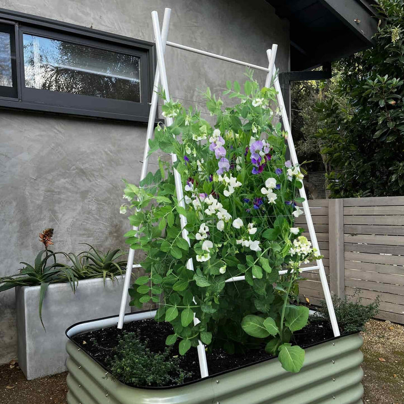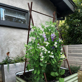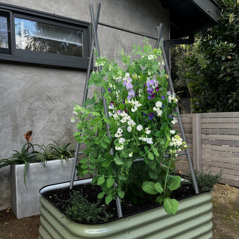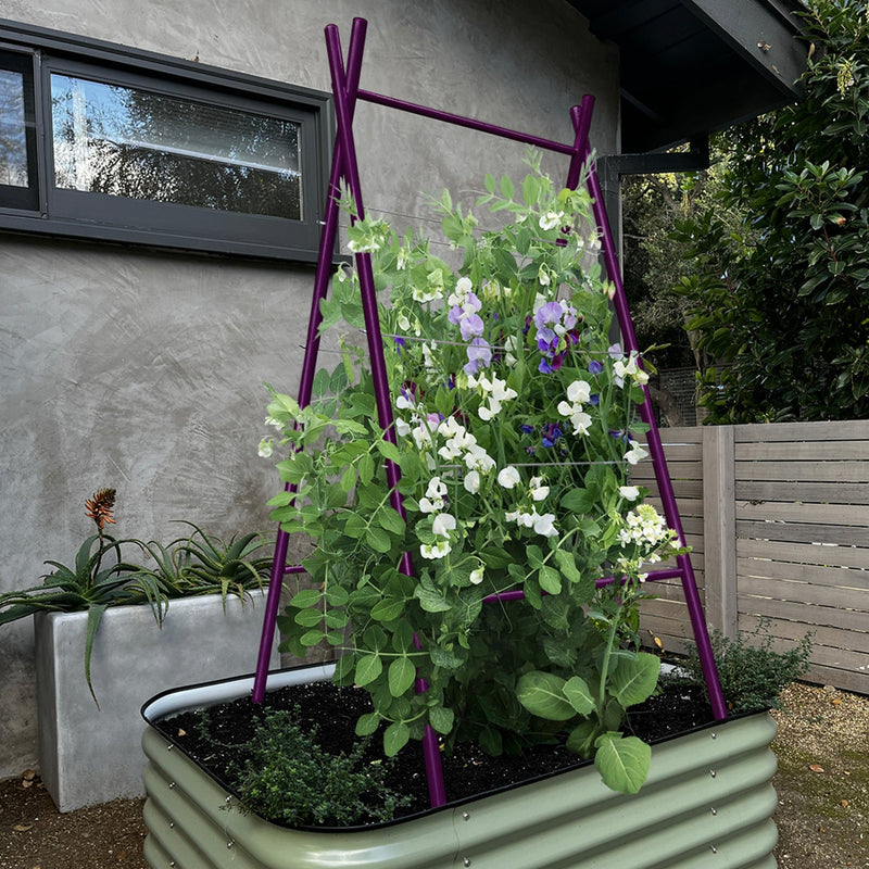 This modern A-frame trellis is a sleek and sturdy colorful support for edible or ornamental plants. Perfect to pop up in a Epic Gardening raised Birdies bed or an in-ground garden. Provides architectural element in the garden year round. Gardening string can be tied to top and bottom bars for additional vertical climbing. Self-standing, impactful in multiples.