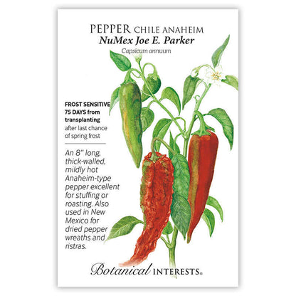 NuMex Joe E. Parker' is the ideal pepper for roasting, stuffing, or canning, in addition to using fresh. This pepper has thick walls, uniform, 6"-8"-long fruit, with few seeds and big yields! Very productive plants. Peppers turn red when mature. 500-2,500 Scoville heat units (mild).