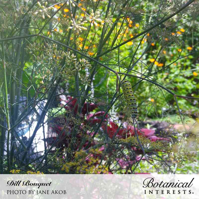 Particularly good for pickling because of early and abundant seed production, 'Bouquet's' foliage is also delicious sprinkled on potatoes, tomatoes, salmon, spinach, cucumbers, and lamb chops. Very aromatic. Dill is an important host plant for caterpillars of swallowtail butterflies.
