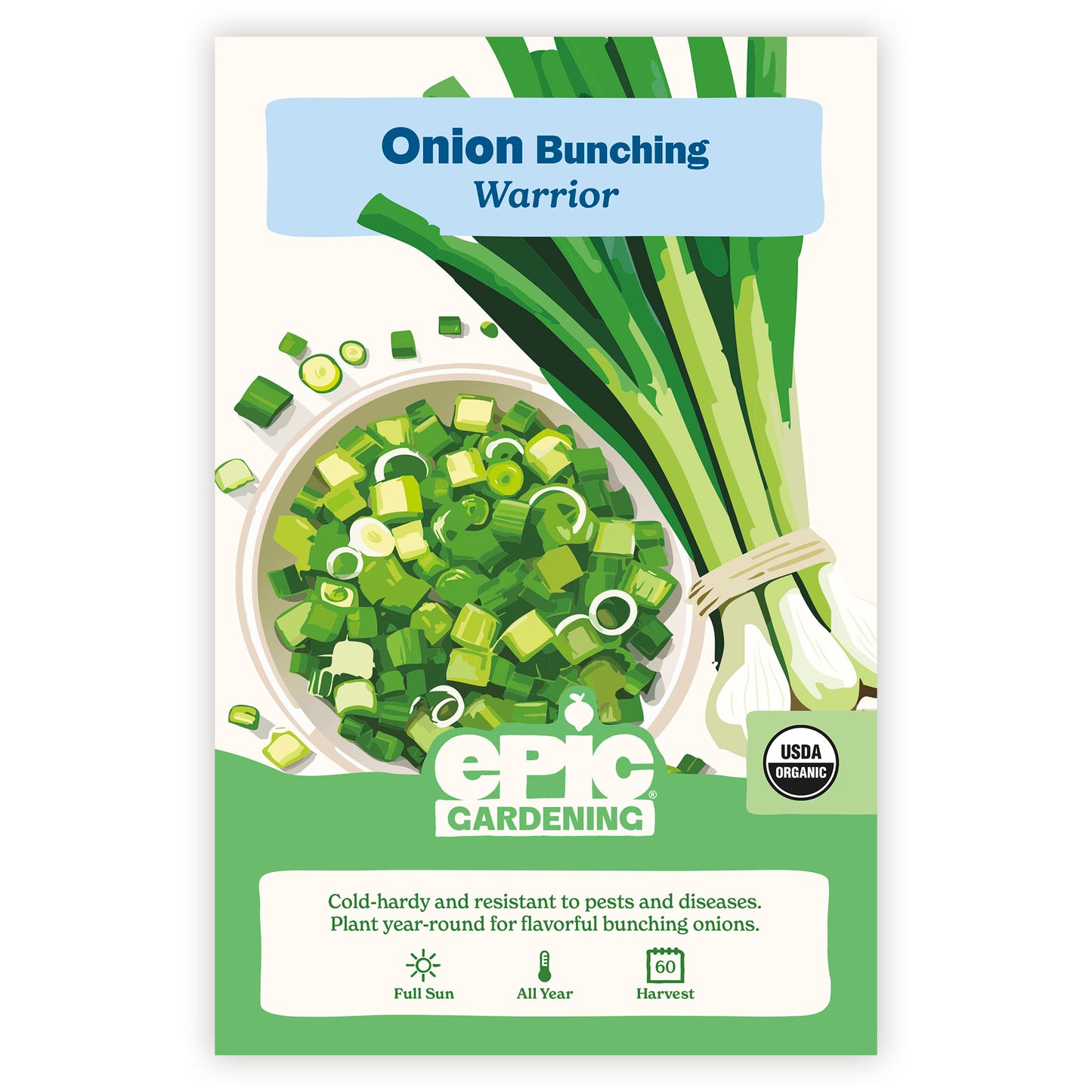 This 2016 All-America Selections winner is known for its crisp texture and strong, pungent flavor. Warrior is cold-hardy, resistant to pink root rot, and pest-resistant, and it’s great for either cut-and-come-again harvesting or full-cluster harvesting. Each cluster of lovely, upright green onions develops a 1/2" white bulb and can be stored right in the garden until needed in the kitchen.